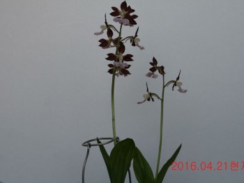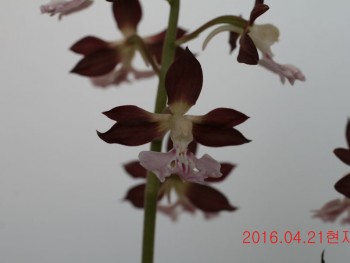 한국새우란이며 짙은 적색의 잠자리형의 화판에 짙은 색설의 아름답습니다.