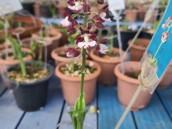 붉은 화색에 백설로 핑크색이 감도는 설판으로 매판형에 화형단정한 소형종 새우란입니다.