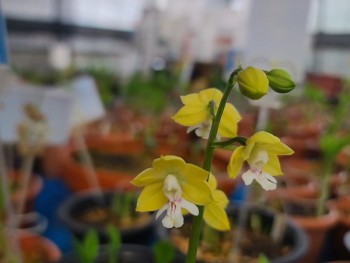매판형의 단정한 화형을 갖춘 황금색 백설이 새우란입니다.