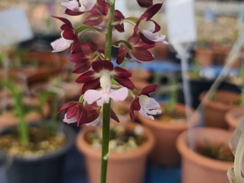 붉은 화색에 백설로 핑크색이 감도는 설판으로 매판형에 화형단정한 소형종 새우란입니다.
