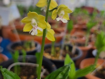 매판형의 단정한 화형을 갖춘 황금색 백설이 새우란입니다.